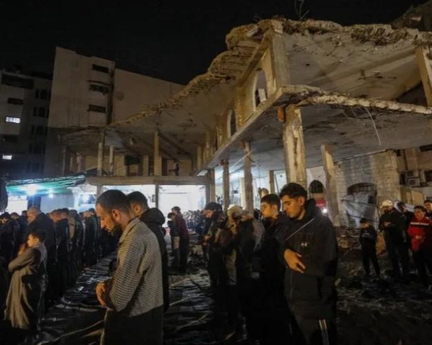 وفي أولى ليالي الشهر المبارك، أحيا فلسطينيو غزة صلاة التراويح فوق أنقاض المساجد المدمرة، وفي مصليات مؤقتة شُيّدت من النايلون والأخشاب، وأدى المصلون صلاتهم في حين كانت طائرات الاستطلاع الإسرائيلية تحوم في سماء القطاع.
