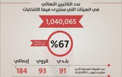 قالت لجنة الانتخابات المركزية، اليوم الثلاثاء، إن عدد الناخبين النهائي في الهيئات التي ستجرى فيها الانتخابات المحلية يوم 25 نيسان بلغ مليونا و40 ألف ناخب وناخبة، وهو ما يشكل نسبة 67% من إجمالي سجل الناخبين.