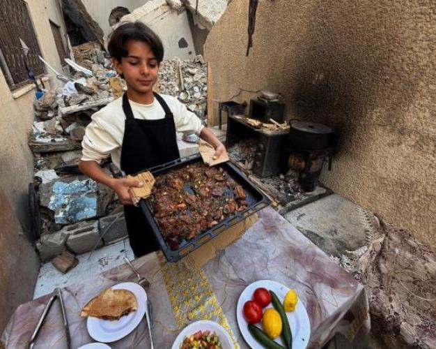 ياسر عياد، فتى فلسطيني يبلغ من العمر أربعة عشر عامًا، يمارس مهاراته في الطبخ على نار الحطب بجوار أنقاض منزل عائلته المدمر في مدينة غزة.